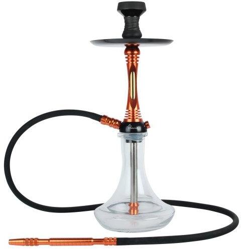 Shark márkájú, narancssárga színű shisha, átlátszó víztartállyal és fekete zsívócsővel, 55 cm magas. A vízipipához egy szívócsövet lehet csatlakoztatni. A középső rész ...